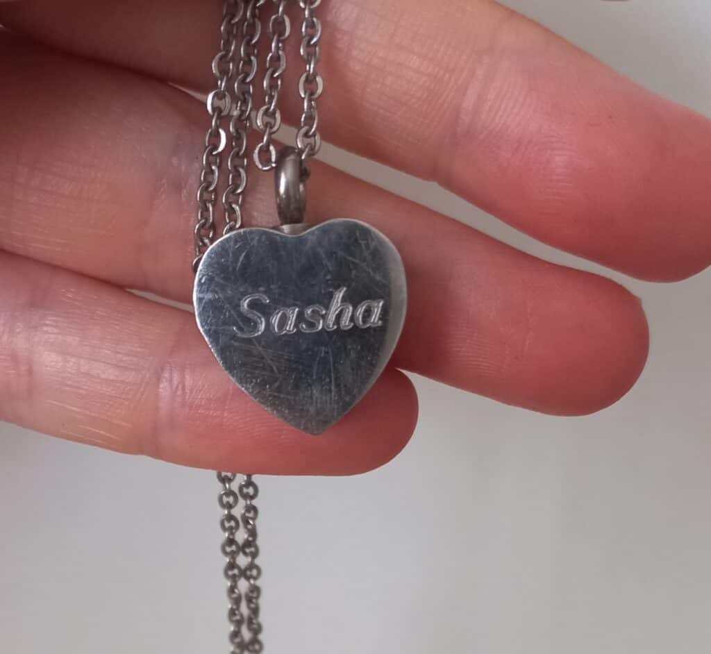 Some time after Sasha’s passing, I bought a heart-shaped locket with her name engraved on the back. You can also find lockets for ashes or small cremation urns on eBay or Amazon. These keepsakes and necklaces allow you to store a tiny amount of ashes inside the actual locket.